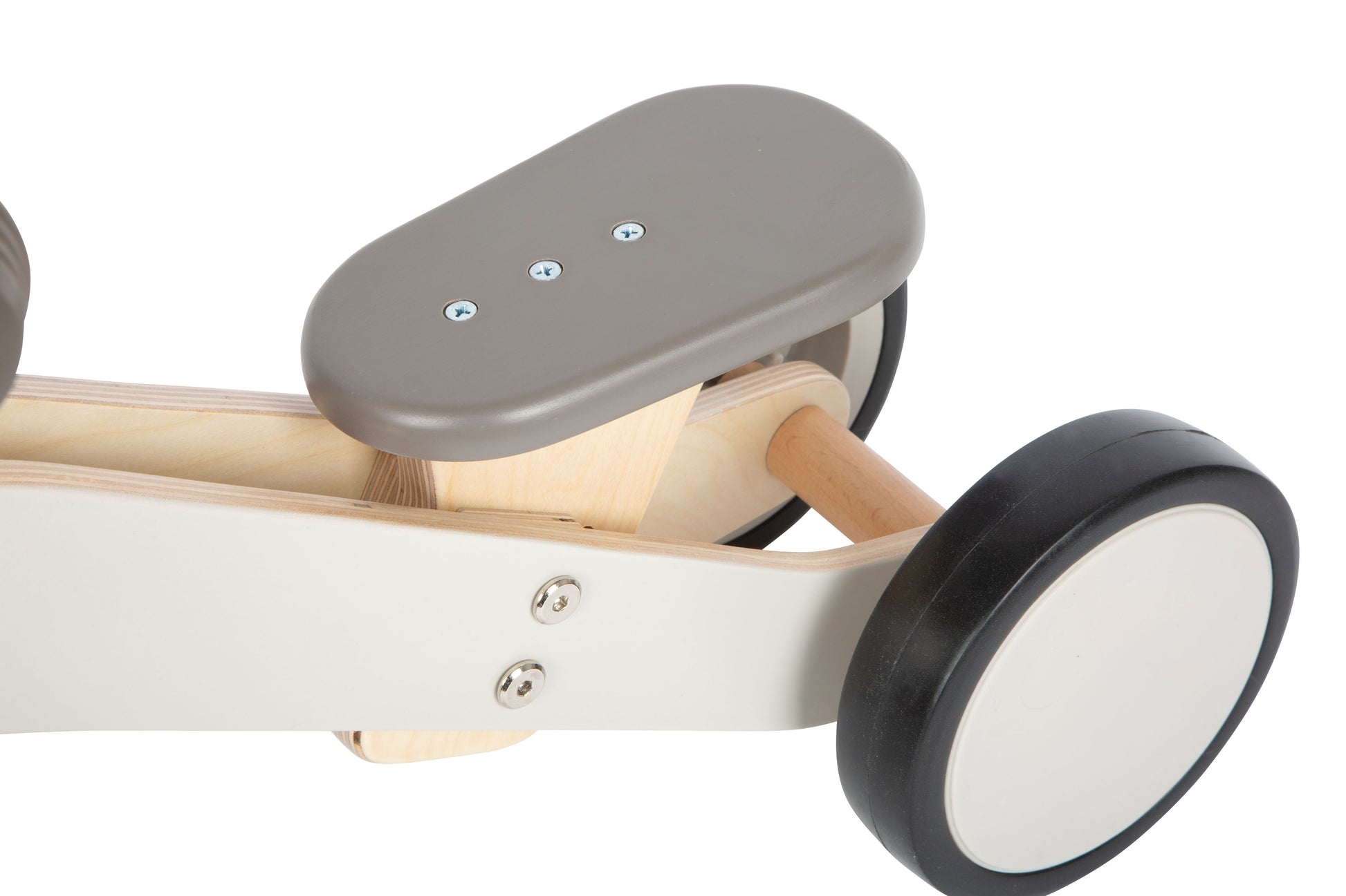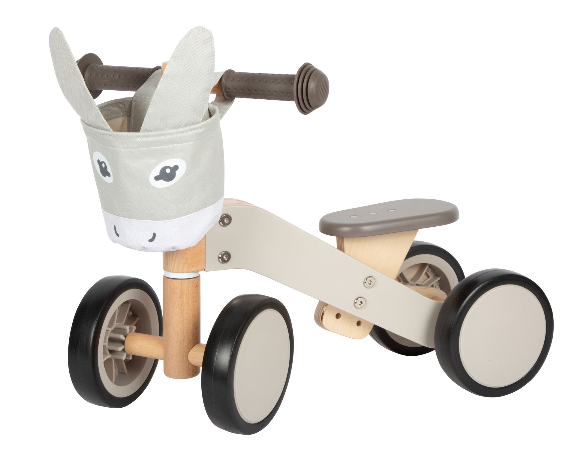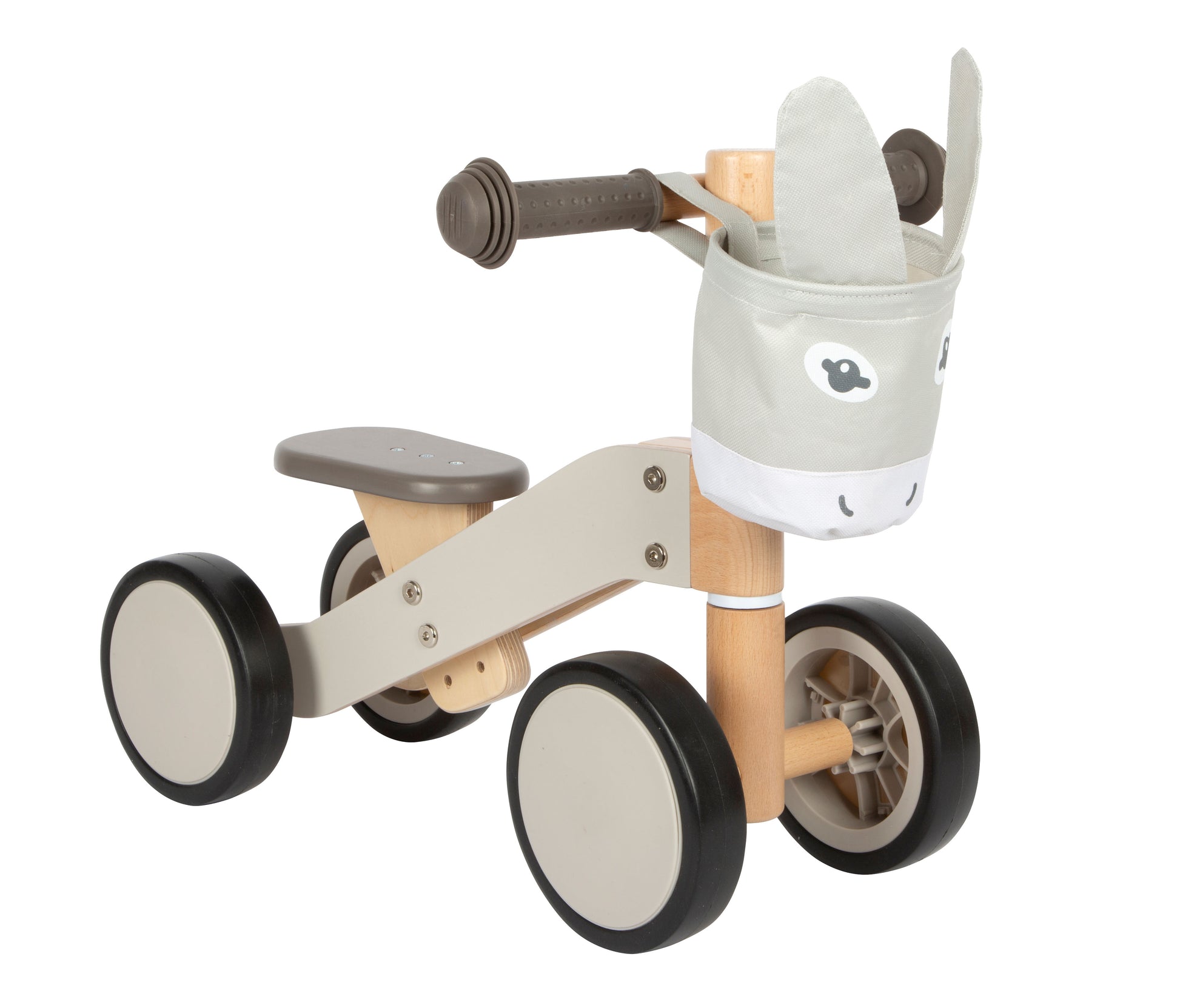 Der kompakte Holzrutscher überzeugt durch seine klare Formsprache und die funktionale Ausstattung. Die hinteren Räder stehen eng beieinander und bieten dadurch besonders viel Beinfreiheit beim Abstoßen. Für die nötige Sicherheit sorgen der stabile Stand, die Einschlagbegrenzung am Lenker und die Griffe aus Kunststoff, die ein Abrutschen der Hände verhindern. Der Sitz lässt sich in der Höhe sowie im Abstand zum Lenker verändern, sodass der Rutscher an die Größe des Kindes individuell angepasst werden kann. Die abnehmbare Tasche in Gestalt eines niedlichen Eselkopfes rundet das Design ab und bietet praktischen Stauraum für unterwegs. Die weichen Räder aus Kunststoff schonen empfindliche Böden und sorgen für ein leises Fahrvergnügen – egal ob drinnen oder draußen.